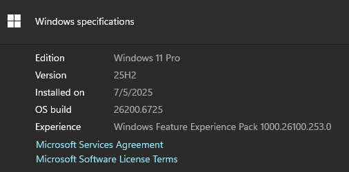 安装完成后,重启电脑,新的系统版本号变成 25H2 了: